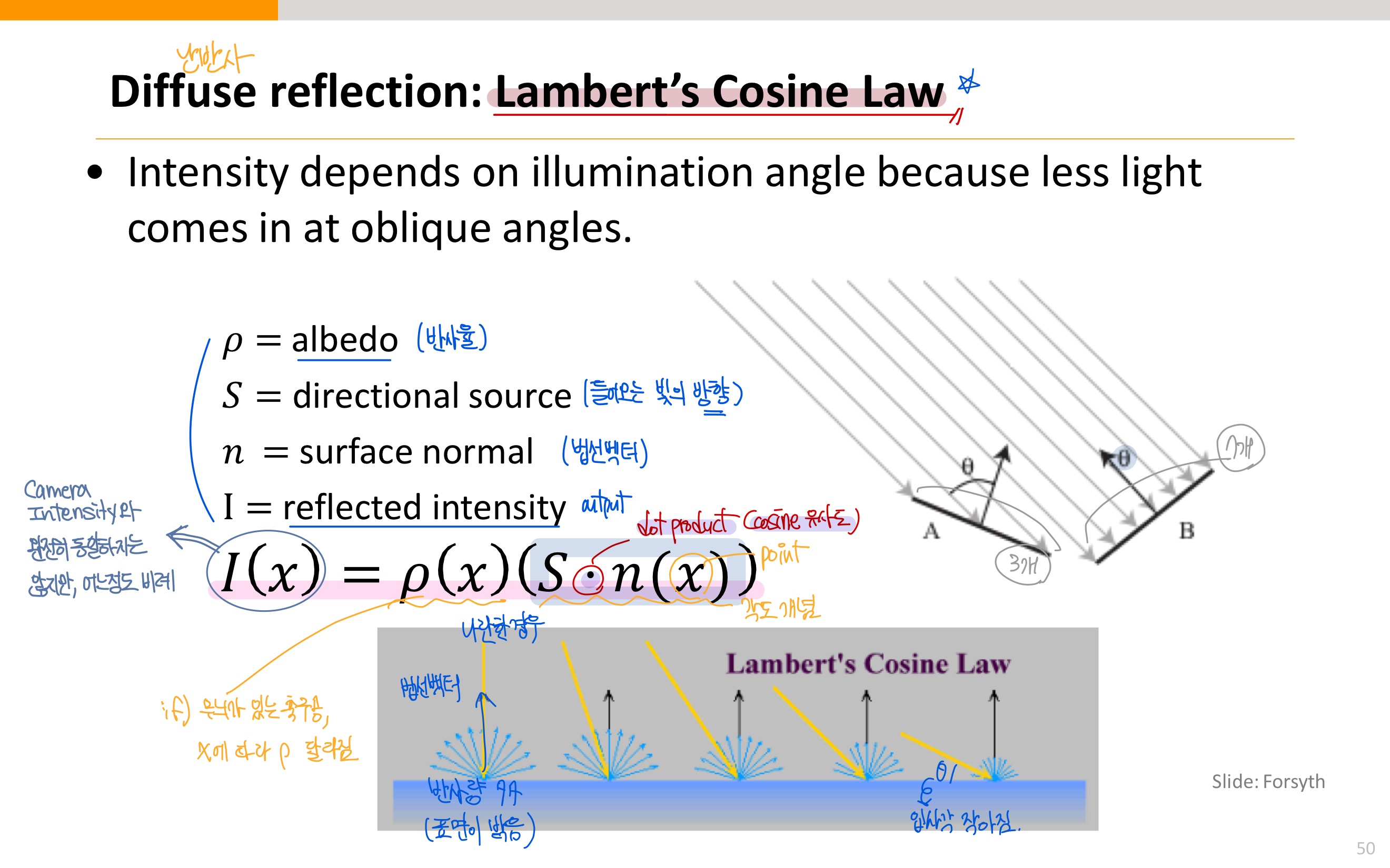 - 즉, 내적은 cosine 유사도를 의미하므로 빛이 들어오는 방향에 대해서 얼마나 반사되는지 그 강도(intensity)가 결정된다는 의미